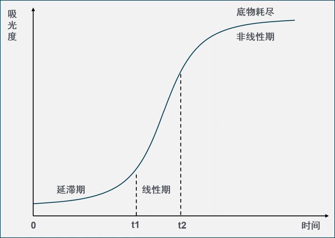 图 5 所示为速率法(常用来检测酶类含量)的基本反应过程,其检测原理是测定线性期的斜率,即吸光度的变化速度,以此来计算物质的浓度。