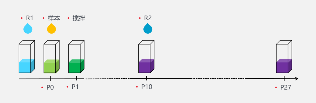 这个过程就好比炒菜一样,油、葱蒜→菜→酱油、盐等调味料,需要按顺序加进锅里,每次加入都需要锅铲进行搅拌均匀,搅拌之后可能还会进行检查尝一下,确定炒熟没有,咸淡是否合适,这个过程就好比在对应检测点进行检测 OD 值。