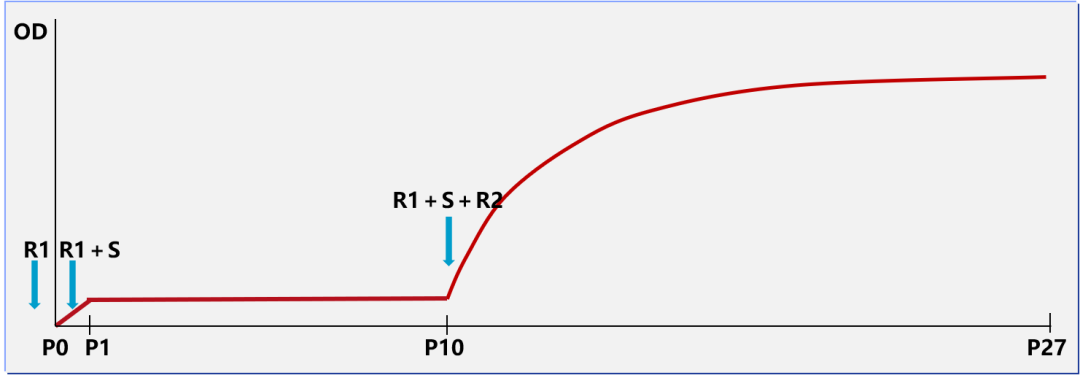 在 P0 点之前,R1 试剂针加入 R1 试剂并使用 R1 搅拌棒搅拌混匀,在 P0 点记录 OD 值;然后加样针在比色杯中加入样本并使用 S 搅拌棒搅拌混匀,在 P1 点记录 OD 值并温育;至 P10 点时,R2 试剂针加入 R2 试剂并 R2 搅拌棒搅拌混匀,然后温育至 P27 点。最后,仪器根据设置的参数信息,提取该项目对应检测点的 OD 值,计算该样本的检测结果。