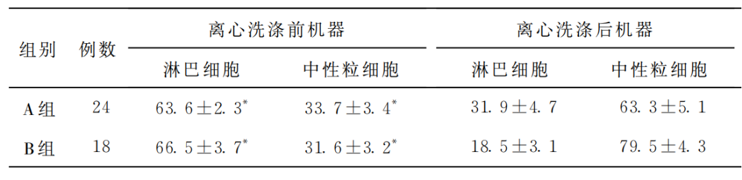 表 2 离心洗涤前后仪器测定白细胞分类计数值比较