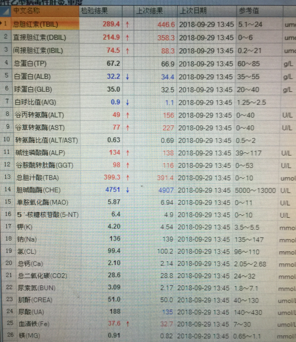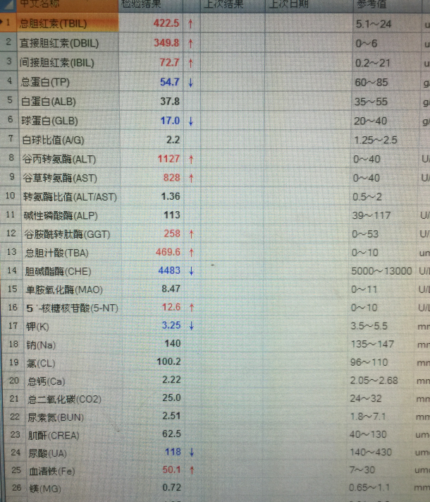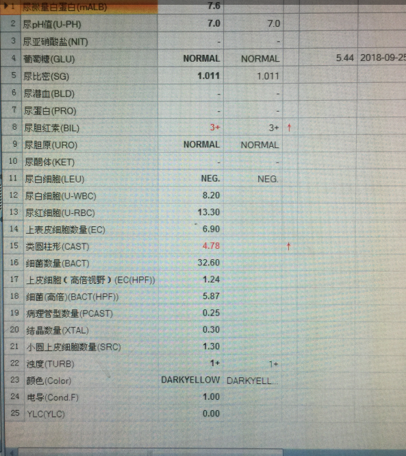 患者尿蛋白阴性,管型却是满视野,且多为肾小管上皮细胞管型,管型均被染成金黄色,应该是被胆汁染上的颜色。患者肝肾功能结果如下图 10: