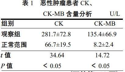 非心肌源性恶性肿瘤患者(肺癌、肠癌、乳腺癌、甲状腺癌、前列腺及膀胱癌等)sCK 及 CK-MB 水平高于正常范围,CK-MB/CK 异常率高【7】。