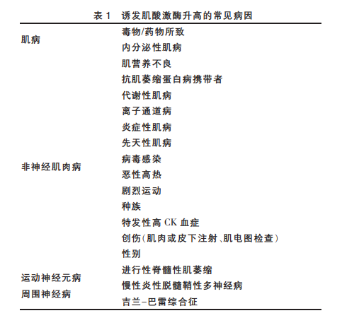 非肌病性包括:肿瘤病变、心肌坏死或受损、运动过度肌肉受损、伴有少数进行性脊髓性肌萎缩等神经源性肌萎缩症状、脑炎或脑受损等。