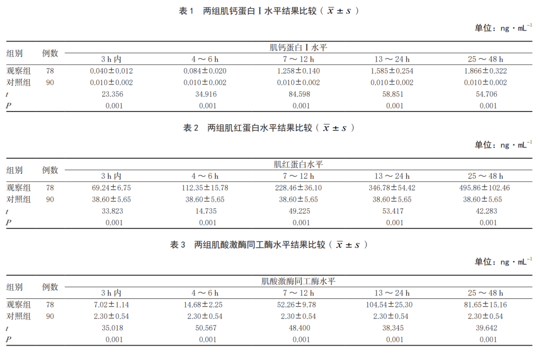 另外,郭爱霞等人【3】研究也发现心肌梗死发生后,不同时间段 CK-MB 的变化情况。观察组发病 3 h 内、4~6 h、7~12 h、13~24 h 及 25~48 h 肌酸激酶同工酶水平均高于对照组,且肌钙蛋白 I、肌红蛋白、肌酸激酶同工酶三项联合检测的准确度、敏感度、特异度、阳性及阴性预测值均高于单项检测。