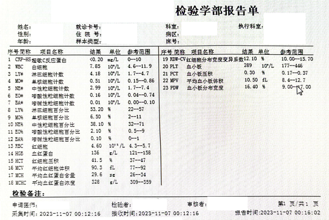 患儿,女,5 岁,1 天前出现发热,最高体温 40 度,伴头痛、全身乏力酸痛,食纳差,精神不佳,自行服用退热药后无明显好转遂来我院就诊。于门诊做一般检查提示双肺呼吸音粗,双侧扁桃体 1 度肿大,后进行血常规及 CRP 检测。