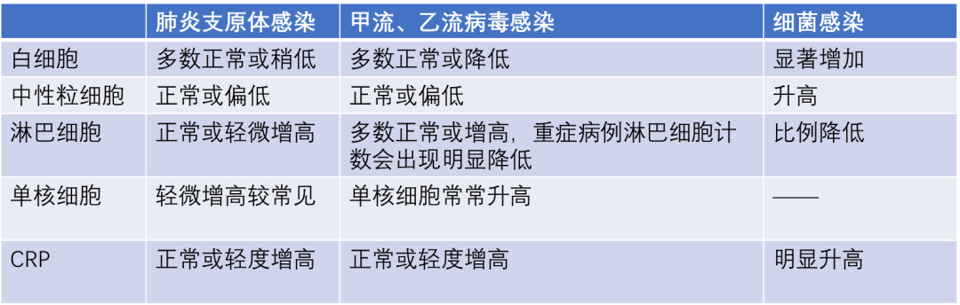 肺炎支原体、流感和细菌感染血常规差异总结: