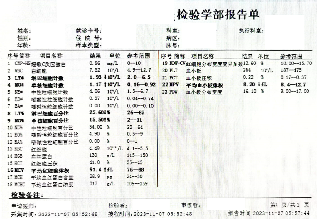 白细胞总数显著增加,尤其是中性粒细胞总数和占比升高,CRP 升高明显,淋巴细胞比例降低。此外,红细胞计数通常正常,血小板计数正常或仅轻度升高。但在长期或重度感染中,外周血白细胞计数和红细胞计数可能会减少。