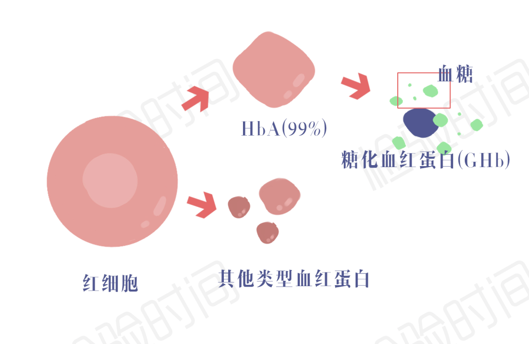 由血红蛋白组成,其中 99% 都为血红蛋白 A(HbA),血红蛋白与血糖进行缓慢的非酶促反应,与血糖结合的那部分血红蛋白就是糖化血红蛋白。
