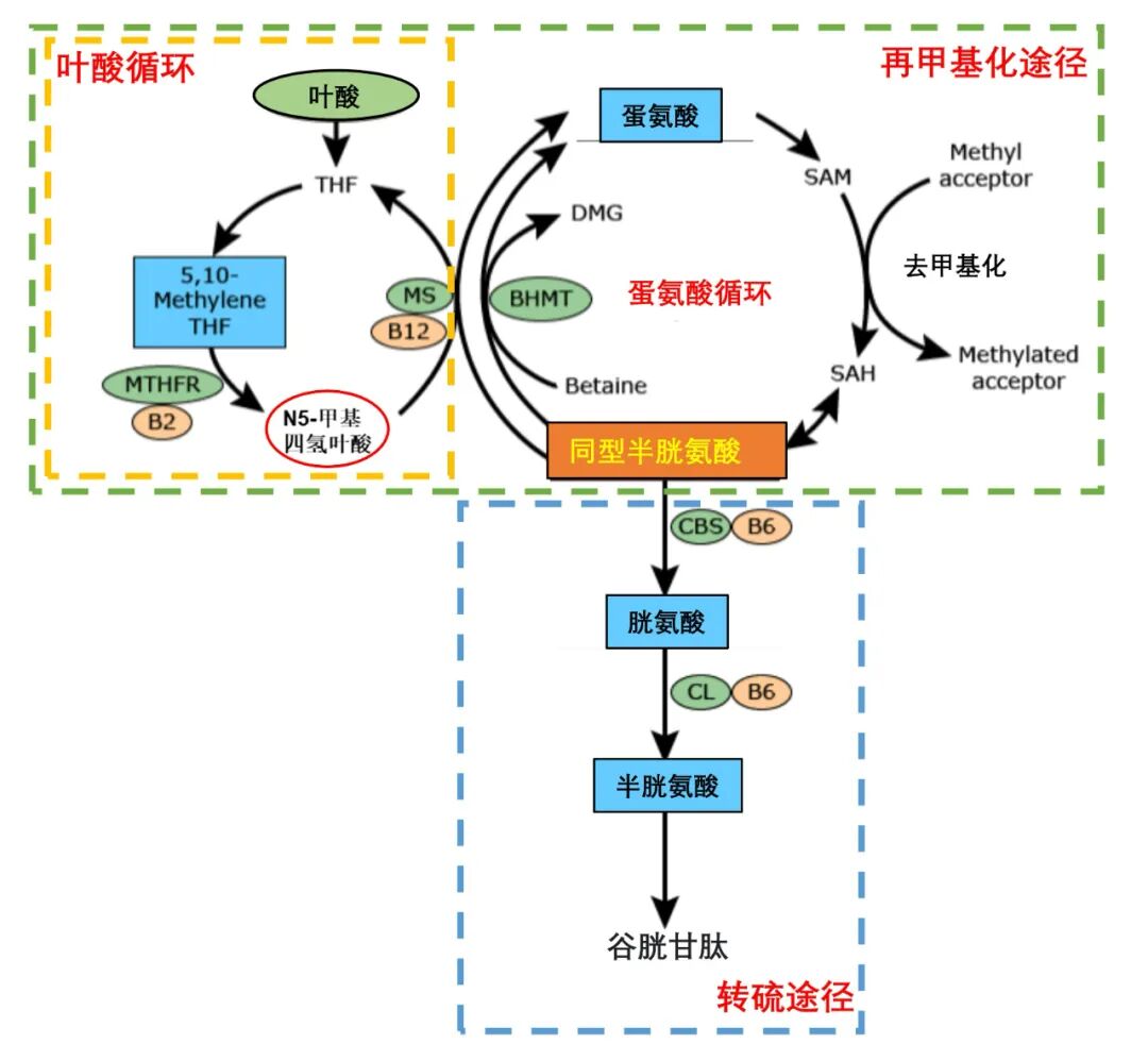 因此任何影响再甲基化途径和叶酸循环的因素都会造成 Hcy 代谢异常:
