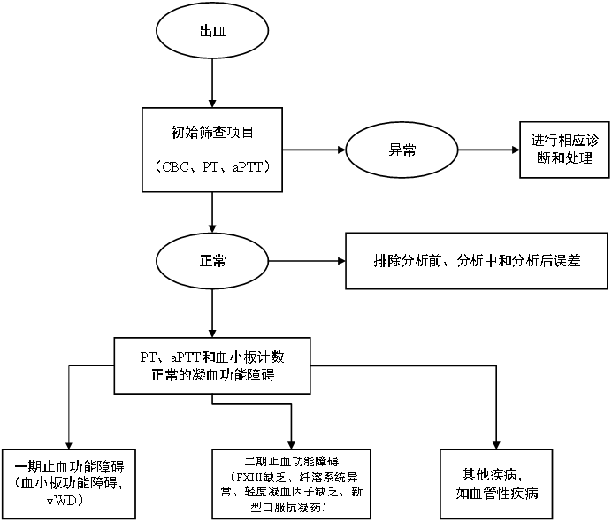 如果排除了标本分析因素,则应考虑涉及血小板、血管性血友病因子 (vWF) 的一期止血障碍、凝血因子缺乏或抗凝物质增多导致的二期止血障碍和纤溶活性亢进引起的出血。