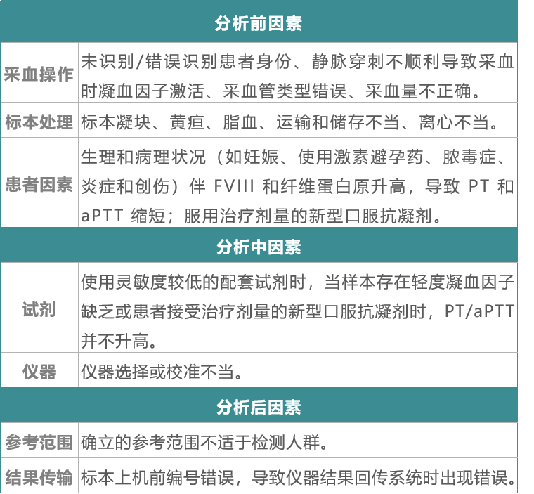 PT/aPTT 可能受到许多分析前、分析中和分析后因素的影响,如表 2 所示: