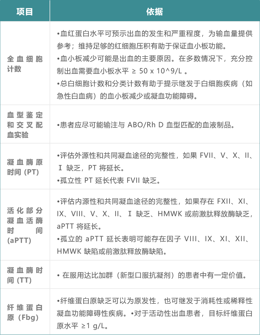 表 1 汇总了在出血患者中推荐的初始实验室检查项目及其依据。实验室检查应在提供紧急止血措施的同时及早进行,并在患者临床状况稳定后复测(考虑到输注血制品对检测结果的影响)。