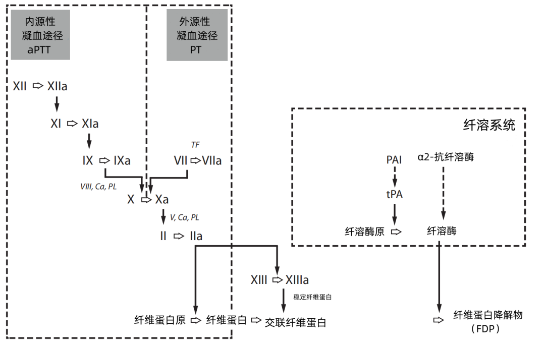 (内源性、外源性和共同途径缺陷通常可由 PT/aPTT 结果反映,但 PT/aPTT 无法反映 FXIII 的纤维蛋白稳定过程和纤溶系统的纤维蛋白降解过程)