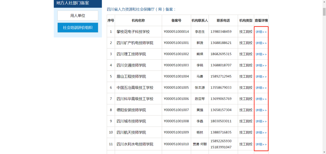可登录四川省人社厅官网(http://rst.sc.gov.cn/),点击“专题专栏-职业技能鉴定-技能人才评价机构信息查询”进入“职业技能等级评价机构公示查询系统”,即可查询经人社部门备案的评价机构相关信息,点击“详细”可查看该机构开展职业技能等级认定的职业(工种)。