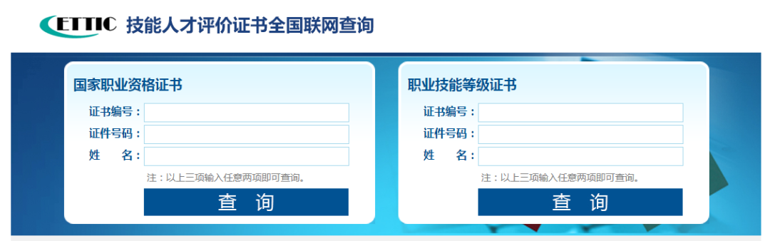 方式一:登录“技能人才评价证书全国联网查询”平台(http://zscx.osta.org.cn),输入“证书编号”“姓名”中任意一项以及“证件号码”即可查询。
