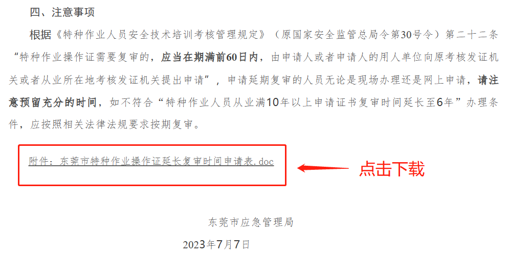 在确认基本条件符合后,请自行下载《东莞市特种作业操作证延长复审时间申请表》(点击文末“阅读原文”下载),按要求进行规范填写,确保字迹清晰、工整。