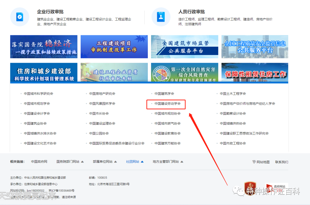 第二步:打开中华人民共和国住房和城乡建设部官方网站,并将网页拖到底部,找到右侧(社团网站),点击找到《中国建设劳动学会》
