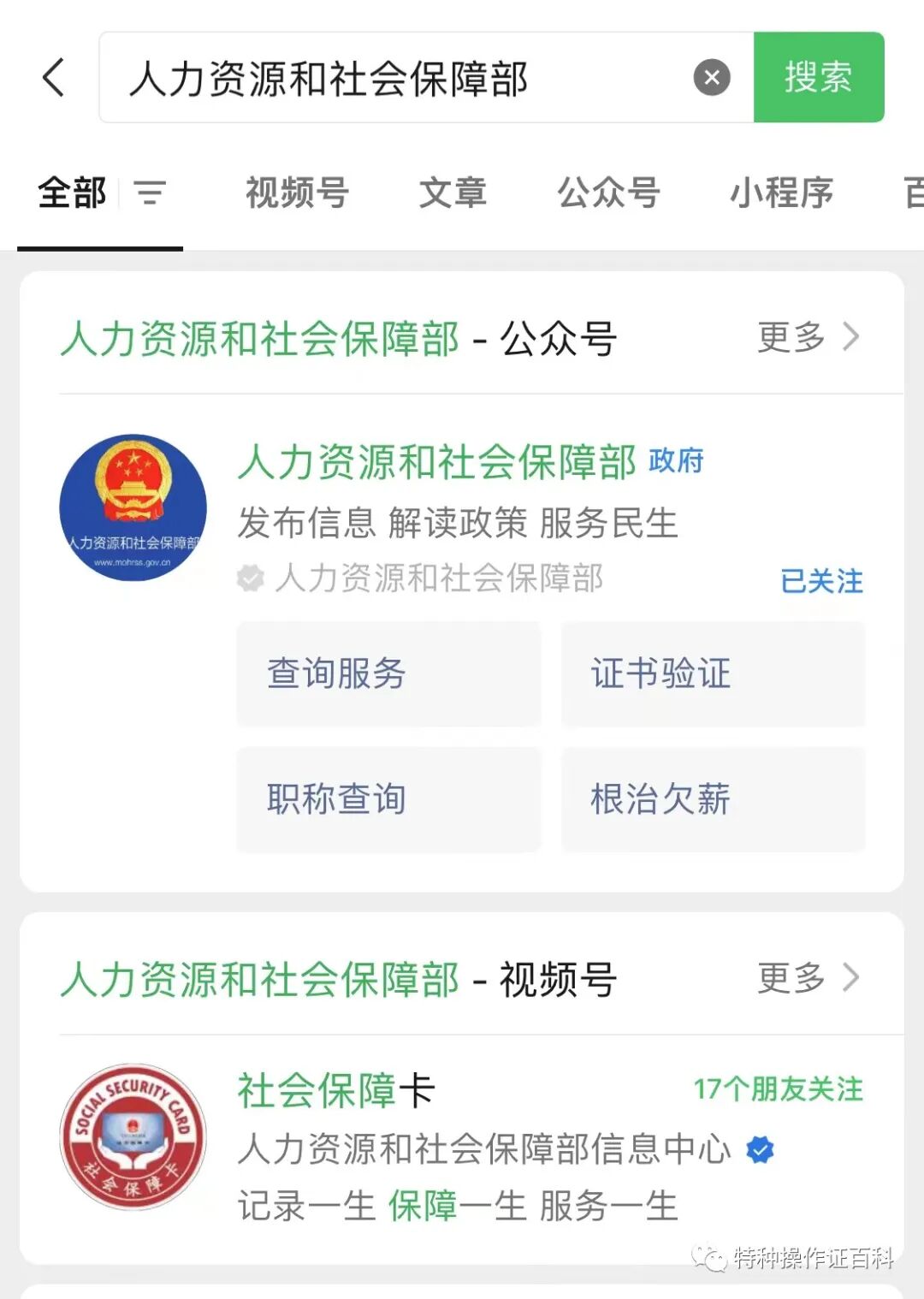 也可以通过“人力资源和社会保障部”微信公众号,点击下方菜单,“证书查询”—“查询服务”—“人事考试证书查询”进行查询;或者点击“证书查询”—“证书验证”—“扫描二维码”,扫描纸质证书、电子证书(或证书电子文件)、专业技术人员职业资格查询结果证明上的二维码进行验证。