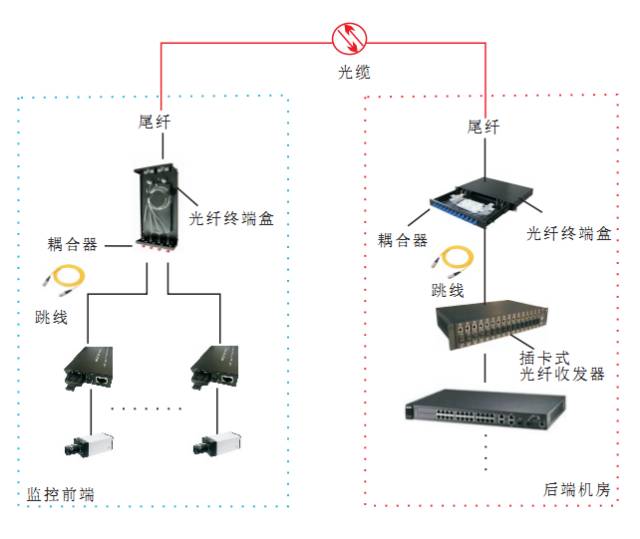👉 通过一对光收发器实现网络信号的传输,传输介质是皮质光纤,运营商使用的入户光纤就属于皮质光纤,具有结实耐用,适合户外部署的优势。