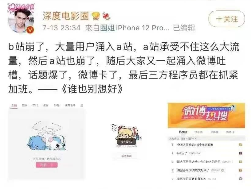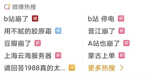 听说这次故障持续了一个多小时,因为B站没得看,网友又跑去A站看,这下A站也崩了,网友更崩溃了。