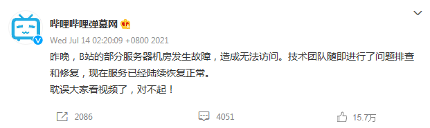 虽然B站只是提到了因为服务器机房发生故障,所以才会出现崩溃的情况。但是具体原因目前还没公布。