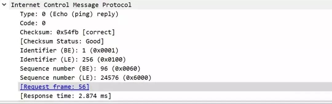 上图的响应报文, Type=0,code=0,这里知道就是响应报文了,然后最后就是根据请求和响应的时间戳计算出来的响应延迟。3379.764ms-3376.890ms=2.874ms。