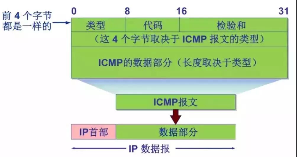 根据上图,你会知道 ICMP协议头包含 4个字节,头部主要用来说明类型和校验 ICMP报文。
