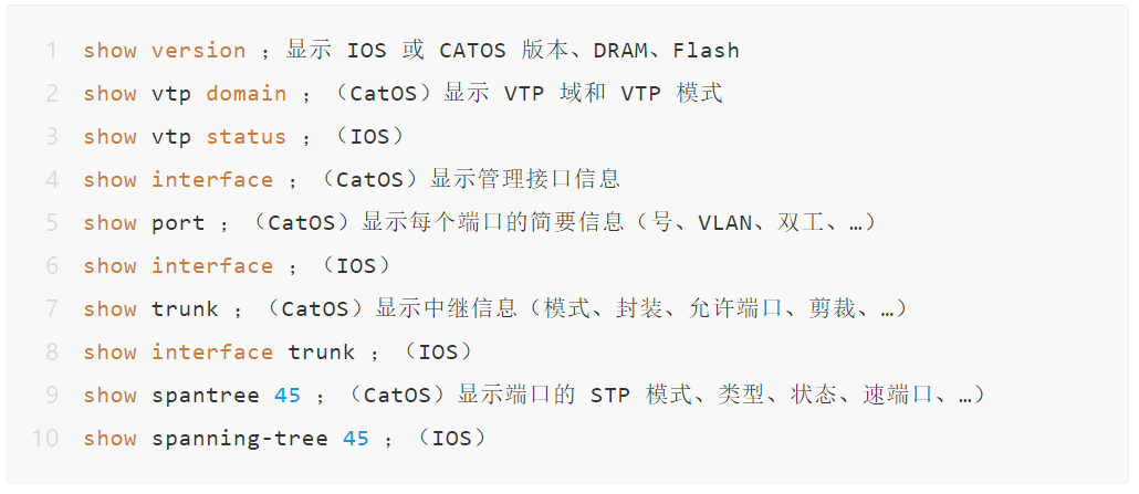 交换机网络配置表包含的信息:设备名、型号、位置、Flash、DRAM、CATOS 版本、管理地址、VTP 域、VTP 模式、端口号、端口速率、端口双工、VLAN、STP 状态、速端口状态、中继状态……