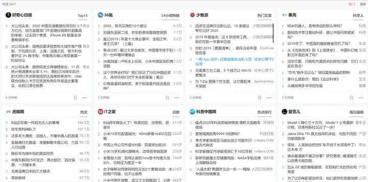 像很多人熟知的知乎热榜、微博热搜、微信热搜,还有一些IT专业网站,比如36氪、好奇心日报、少数派、果壳……都能在这里看到。