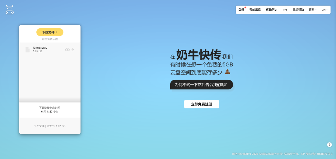 奶牛是一个免费临时大文件传输工具,打开网页即可使用。关键是不限速,用完即走,非常干脆利落。(小程序也有,也很方便)