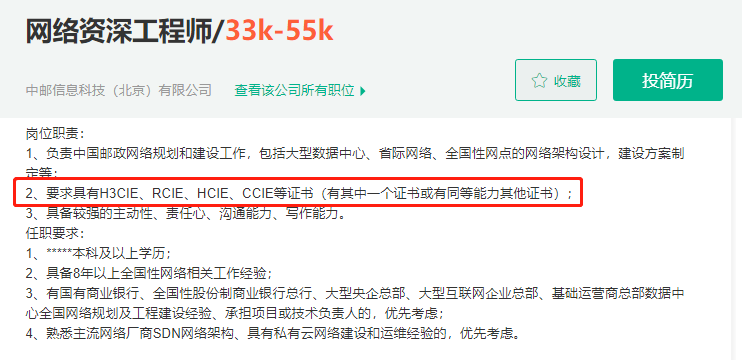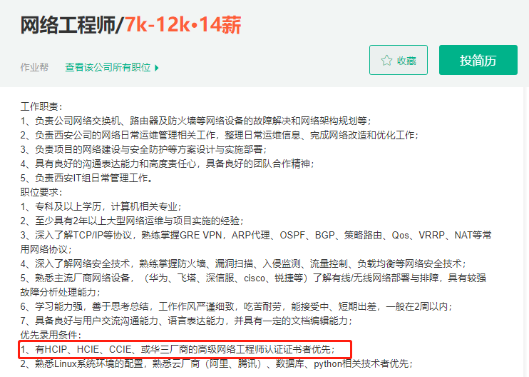 7k和30k,互联网公司和国企,他们都会在岗位jd里写明,要思科或者是华为认证。