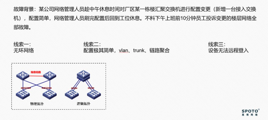 而等到了下午2点钟,上班的人使用网络的时候才发觉,“啊?楼层交换机出现了故障!”,或者说才发觉当时“不能上网了!”