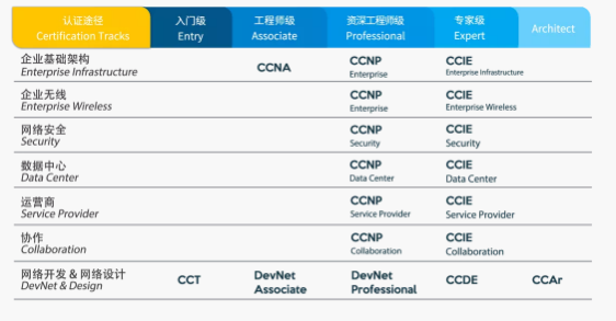 认证共分为五个级别: CCT、CCNA(思科认证网络助理工程师)、CCNP(思科认证网络工程师)、CCIE(思科认证互联网专家)、CCAr(思科认证网络架构师)。