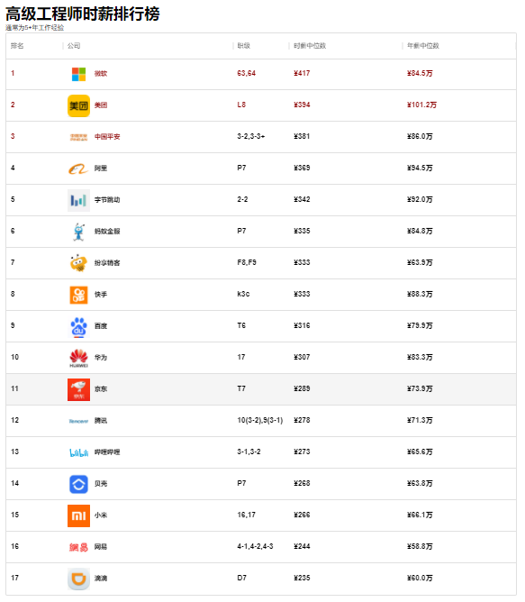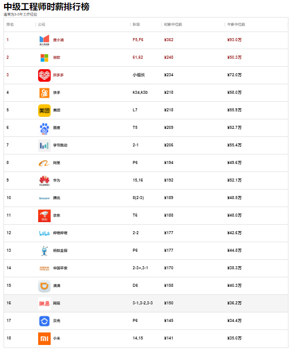 虽然这只是大厂的时薪排行,但也足够反馈整个市场行情了,本份榜单分初级、中级、高级工程师三个榜,午休以2h为准,不计入工作时间。
