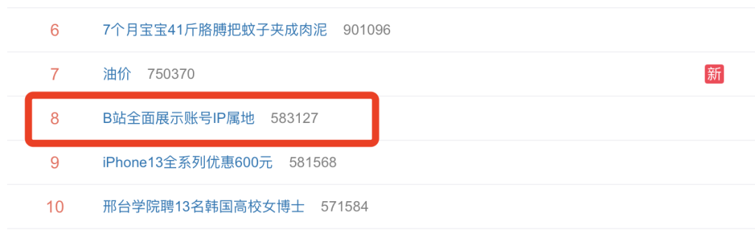 就上周,B站刚更新了可以显示IP归属地,这就冲上热搜好一会儿。