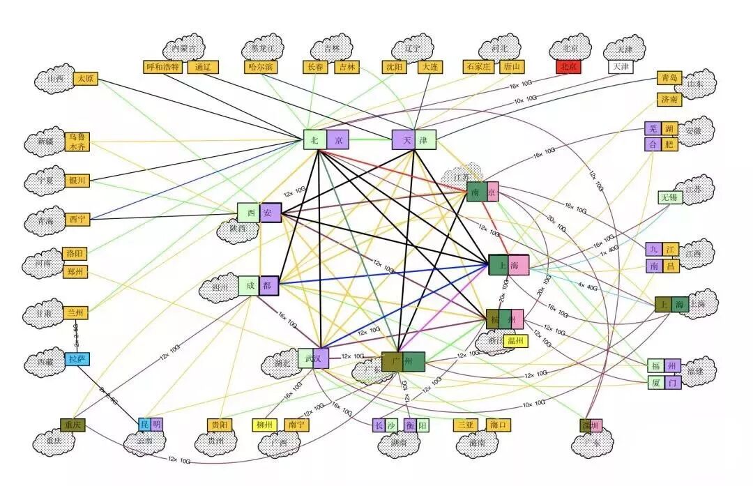 运营商/公安/金融骨干网节点全是路由器,中国电信Chinanet 骨干节点也是高端路由器,拓扑图如下。