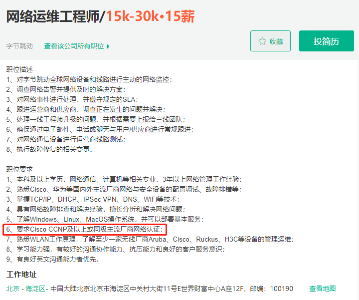 对于企业用人来说,厂商认证的含金量还是非常高的。这是今年字节刚发布的招聘要求,可以仔细研究: