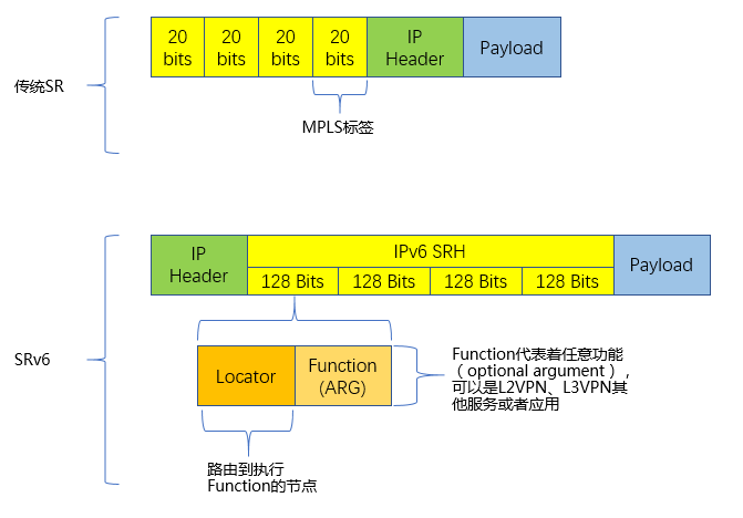 SRv6在IPv6报文中新增了SRH扩展,来替代传统的MPLS下的标签转发功能,并使用128位的IPv6地址作为网线节点标识SID。