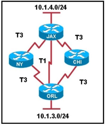D:When EIGRP is the routing protocol, the equal cost paths JAX-CHI-ORL, and JAX-NY-ORL will be installed in the routing table by default.