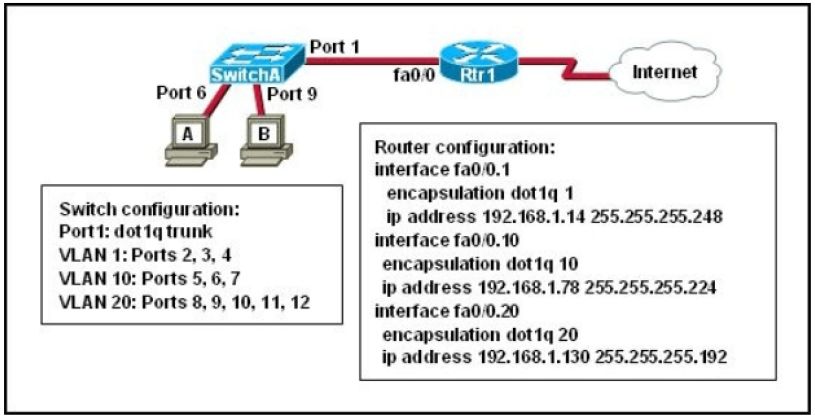 host B 在交换机 9号口上,对应 vlan20 ,查看右边的图可以看出其网关为192.168.1.130再来分析 host A host B 的IP 地址,肯定必须和他的网关在同一个网段上,这样我们很快就选出了答案。