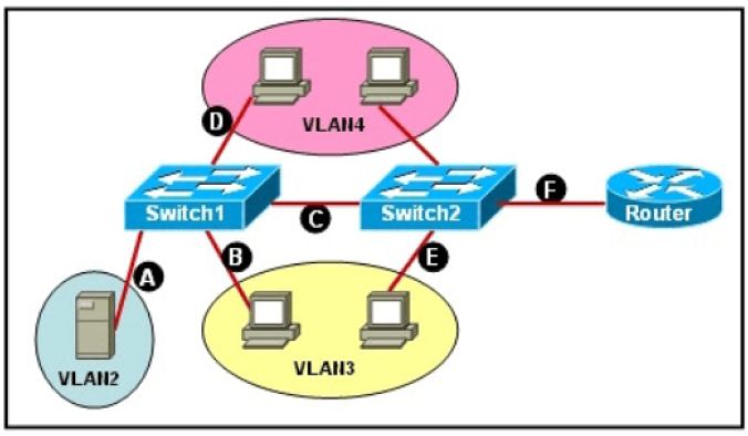 3. Refer to the exhibit. A network associate needs to configure the switches and router in the graphic so that the hosts in VLAN3 and VLAN4 can communicate with the enterprise server in VLAN2. Which two Ethernet segments would need to be configured as trunk links? (Choose two.)