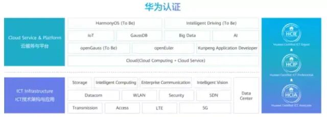 华为认证体系是华为公司凭借多年ICT人才培养经验及对行业发展的深刻理解,基于华为“平台+生态”战略,围绕“云-管-端”协同的新ICT技术架构,打造包含ICT架构认证、ICT开发者认证、行业ICT认证三大类认证的认证体系,是业界唯一覆盖ICT全技术领域的认证体系。