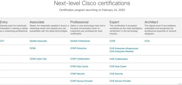 思科认证就是思科公司推出的,是互联网领域的国际权威认证之一,也被誉为十大最难考取的职业认证。思科认证共分为五个级别: CCT、CCNA、CCNP、CCIE、CCAr。