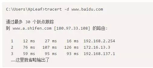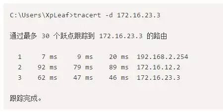 在上面的网络环境中,在网络通的情况下,你在电脑上使用命令tracert -d命令,会得到下面的结果: