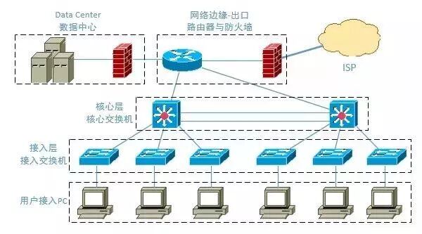 一般中小型企业网络的基本架构都是这样的:接入层--汇聚层--核心层--网络出口。