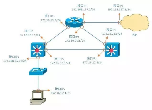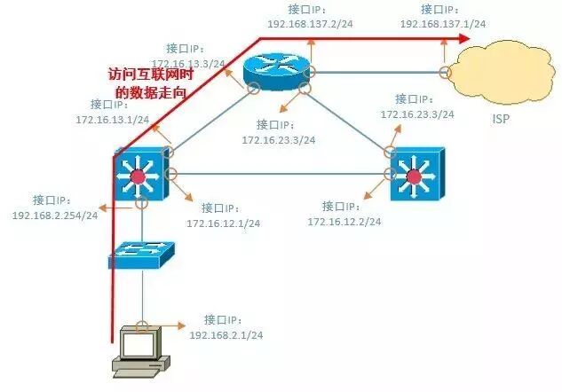 如果网络环境比较庞大,汇聚层和核心层都会有,像这里的话,就直接没有汇聚层,不过思想是一样的。