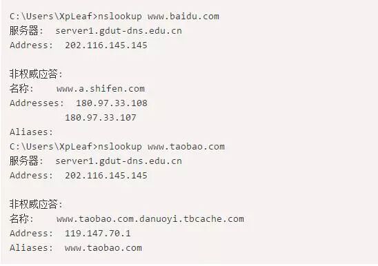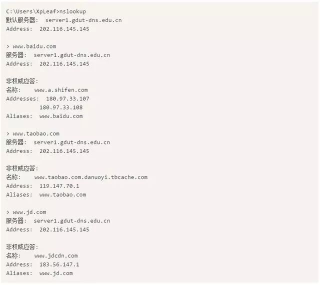 只要可以回显IP地址,那么DNS就没有问题了,不过这里仍然要说一下nslookup这个命令,这是一个非常好用的命令,我平常自己在网络排错时,基本上都会用到: