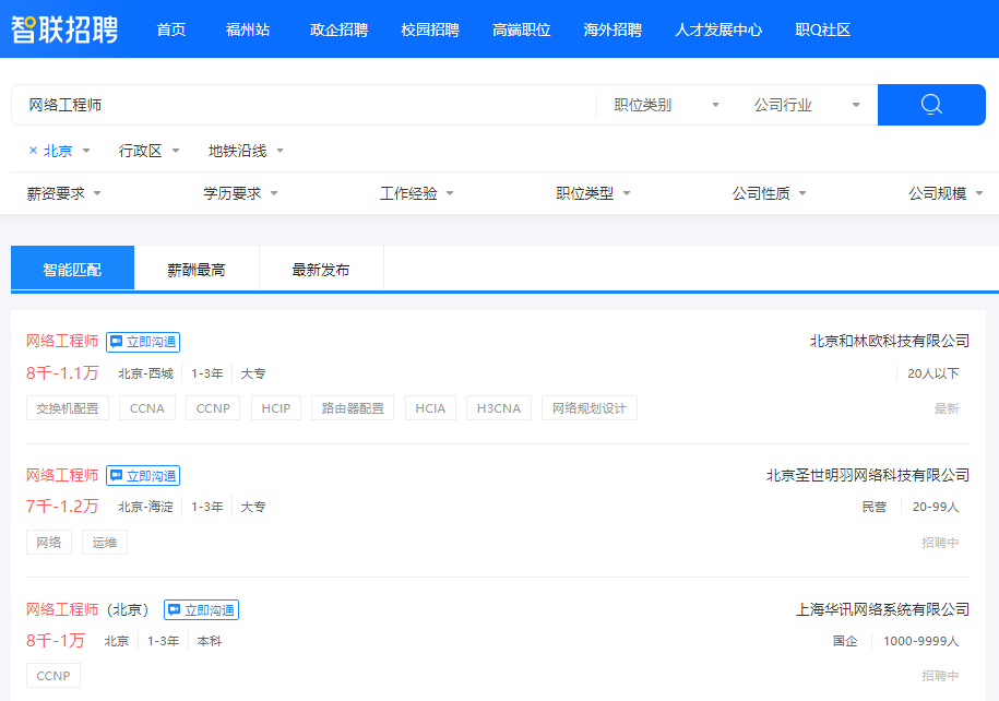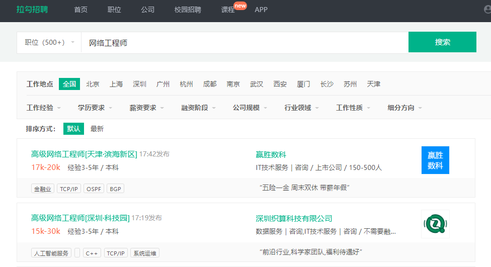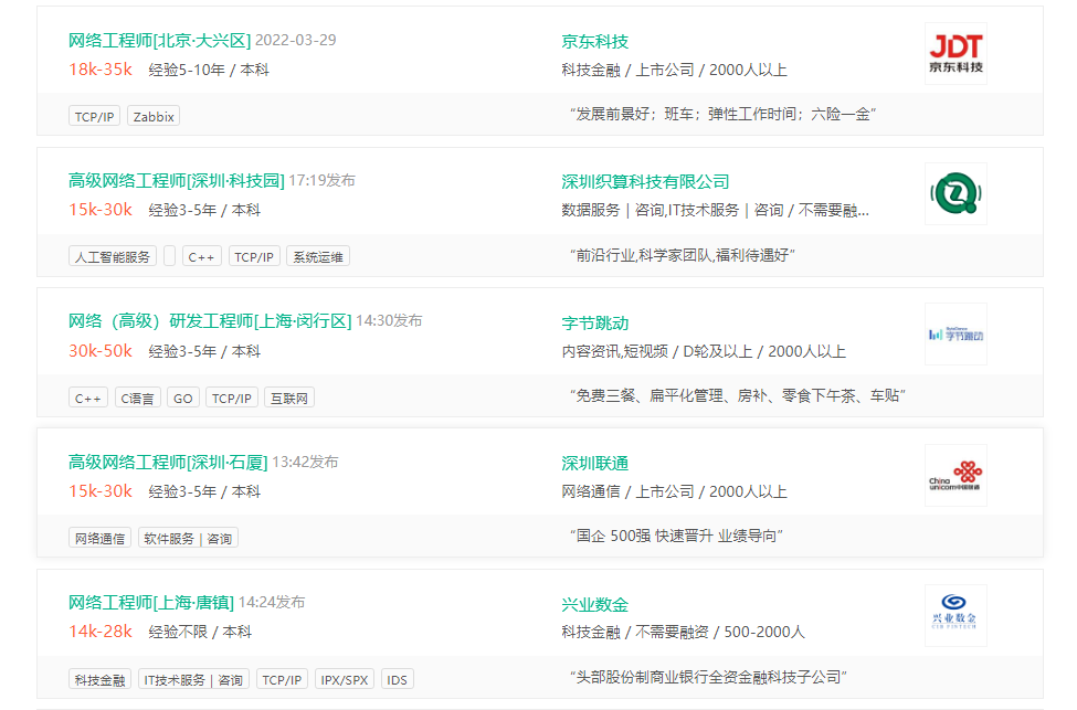 我们来看下一些招聘网站上的网工招聘需求,以智联和拉勾两大平台为例: