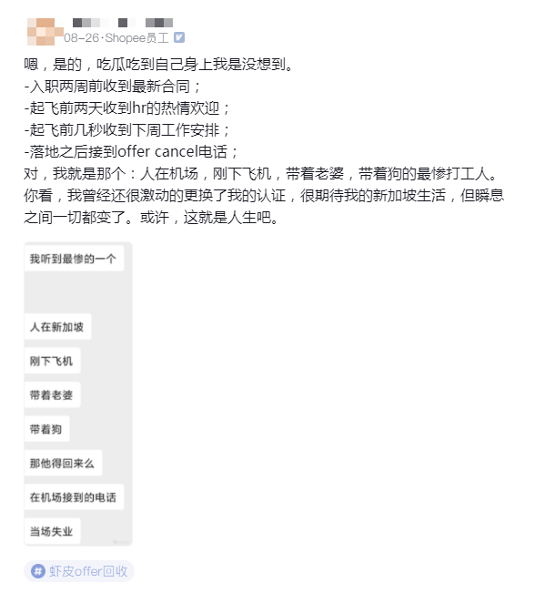 一位应届生小哥接到接到虾皮offer后,携家带口飞到新加坡,结果刚下飞机就发现自己被裁了,前后都不到几天。