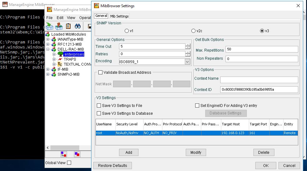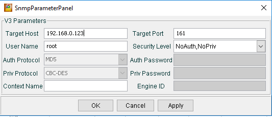 选择了v3之后,点击Add添加用户信息——添加目标主机的IP地址和端口,当需要从服务器获取或设置信息时,管理端会与服务器上SNMP Agent的161端口进行通信,这里认证和加密协议与之前服务器端的设置要保持一致。